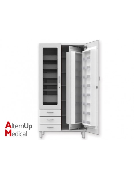 Avec 24 compartiments pour médicaments d’un côté et 6 plateaux ISO à 1 étagère et 3 tiroirs de l’autre.